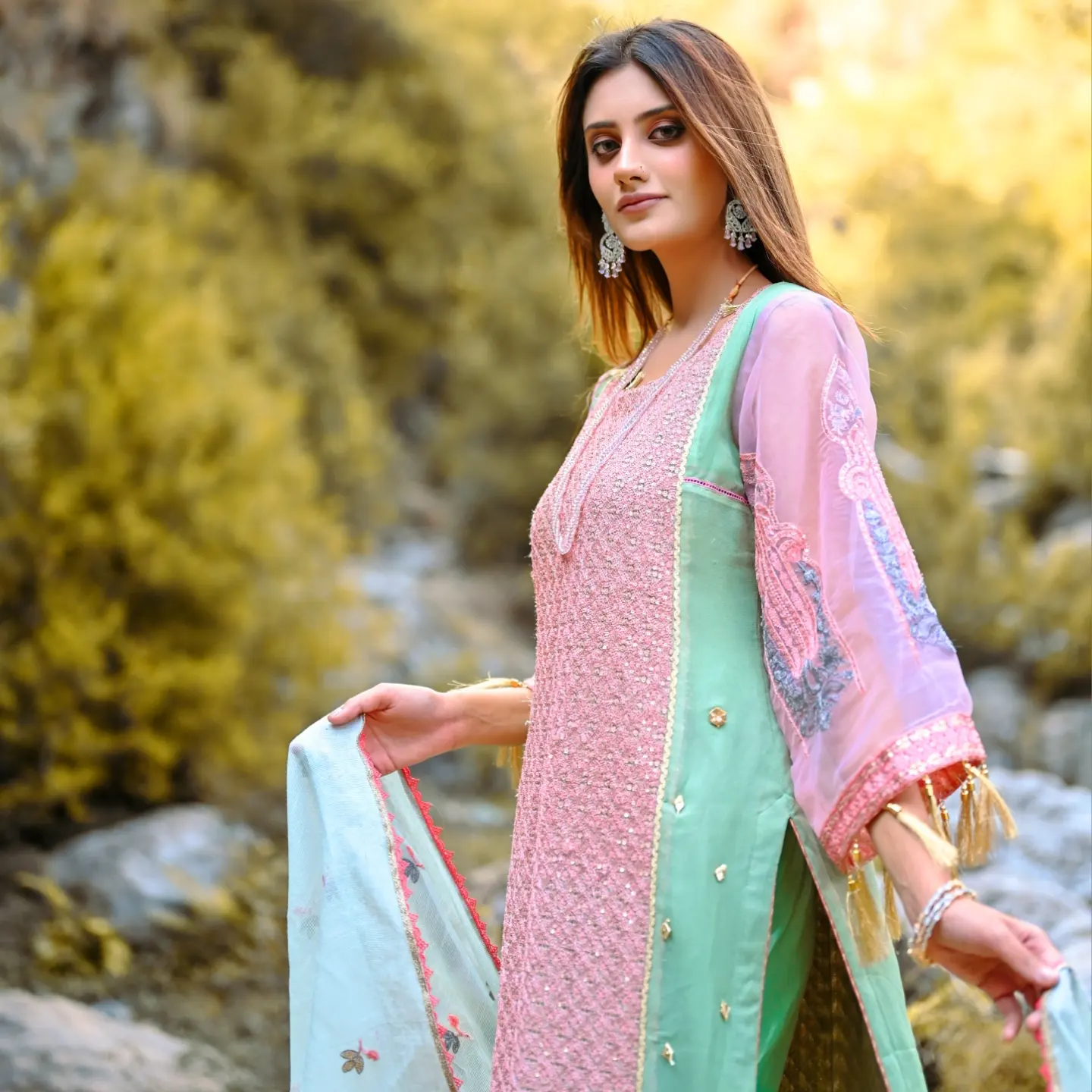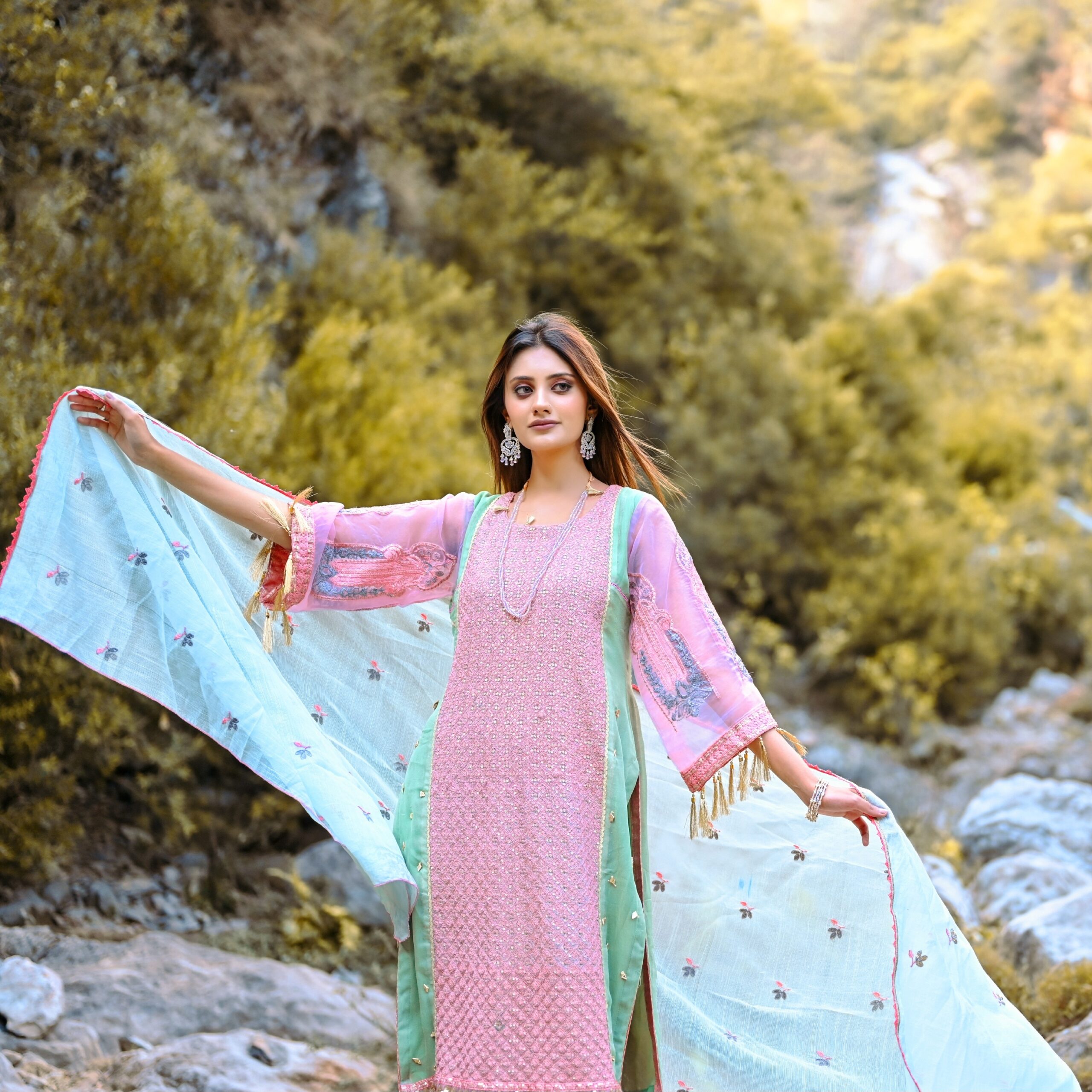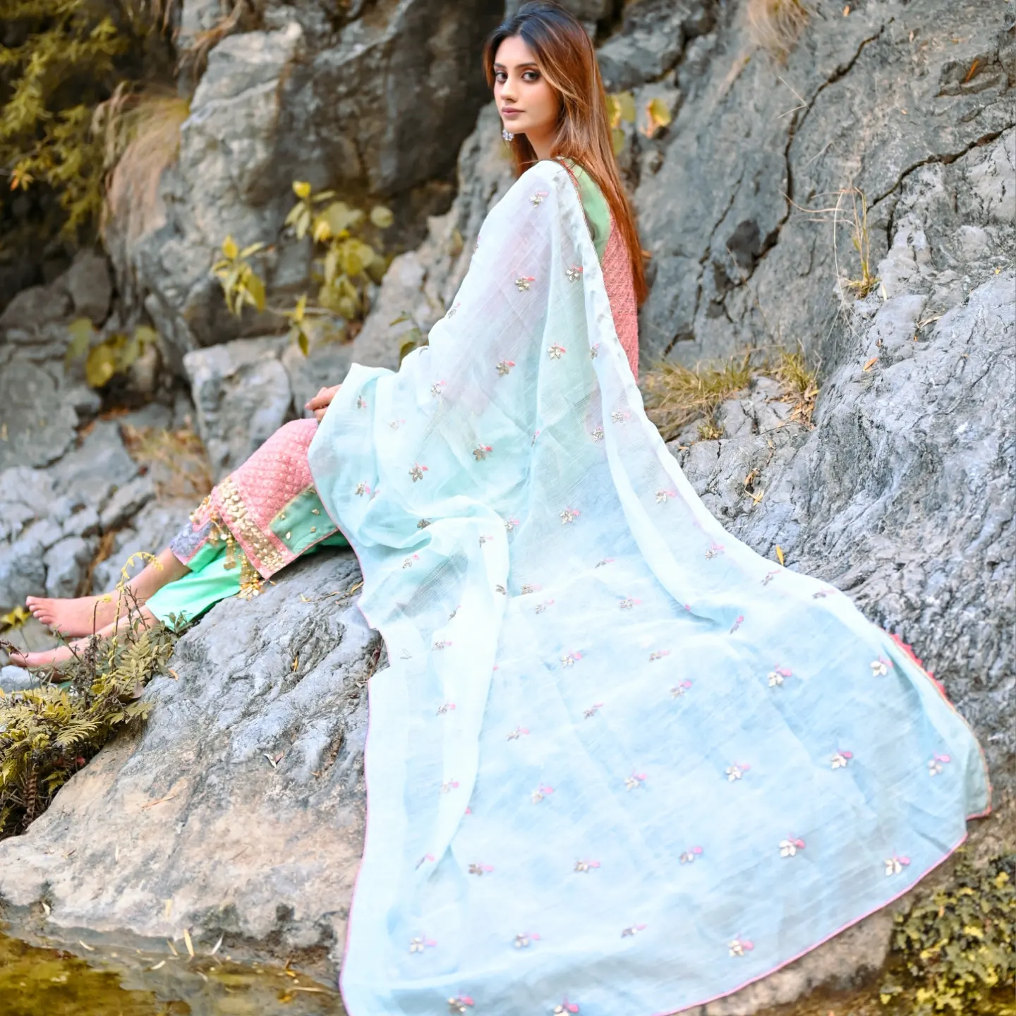 Embroidered dupatta on Khaadi.