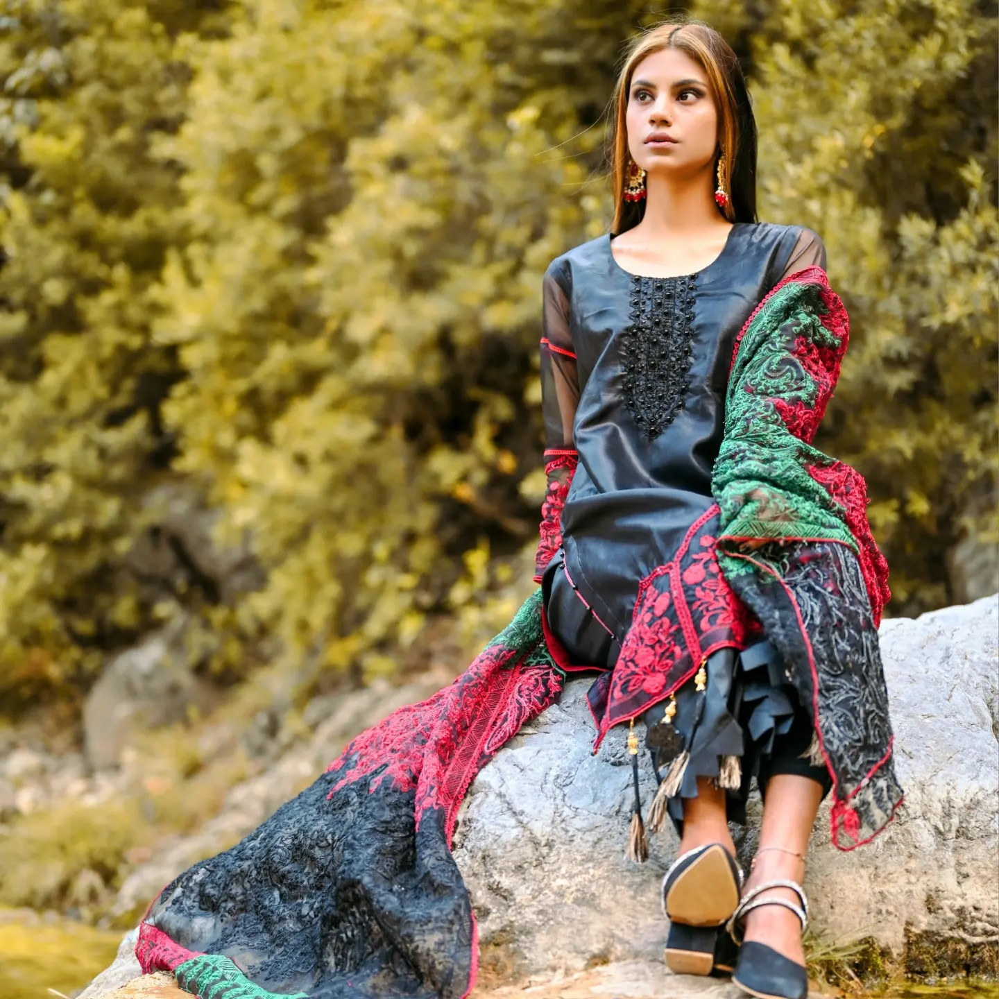 • Pure Organza Fabric Heavily embroidered with sequins and Resham work. Detailed with panels and thread.
