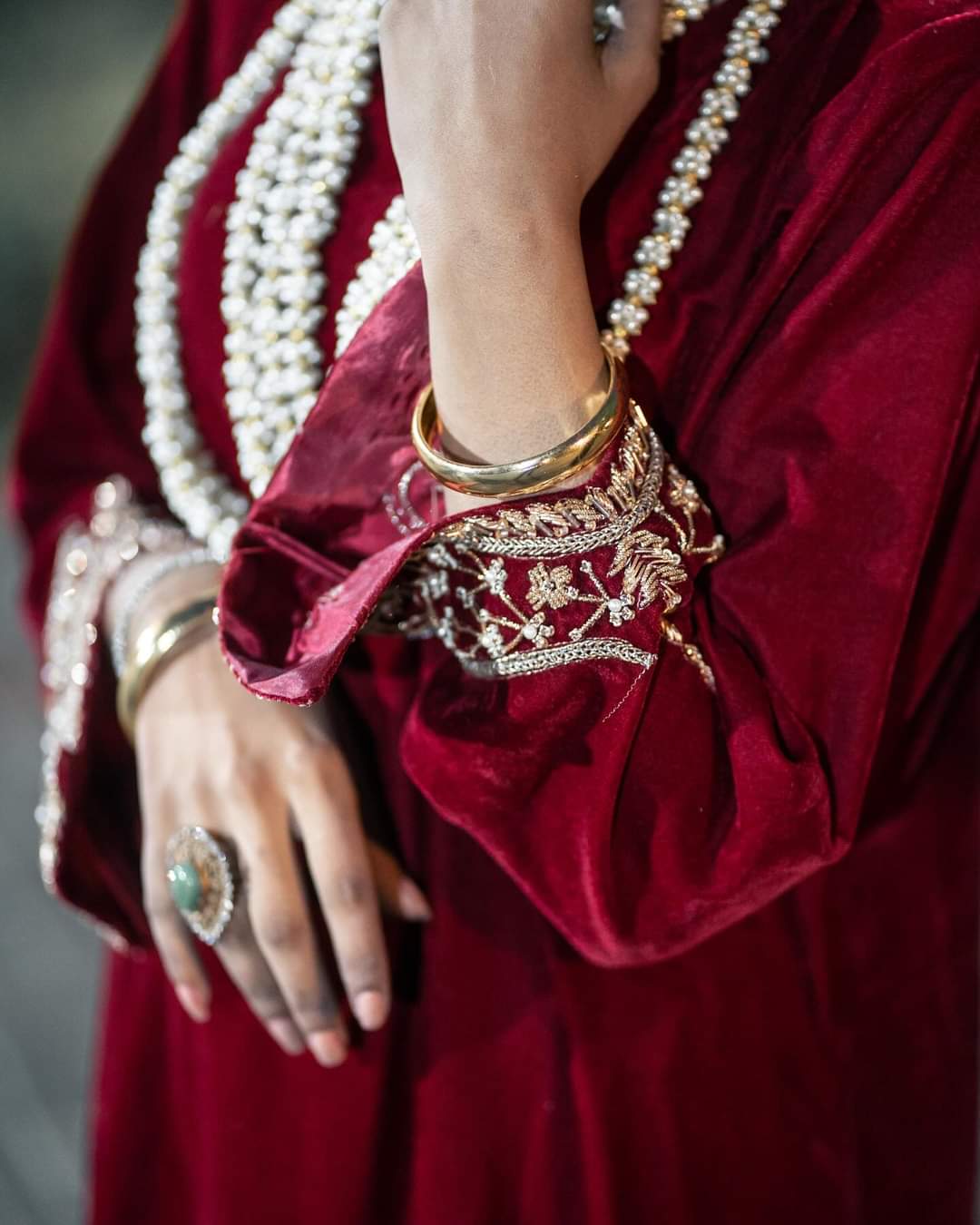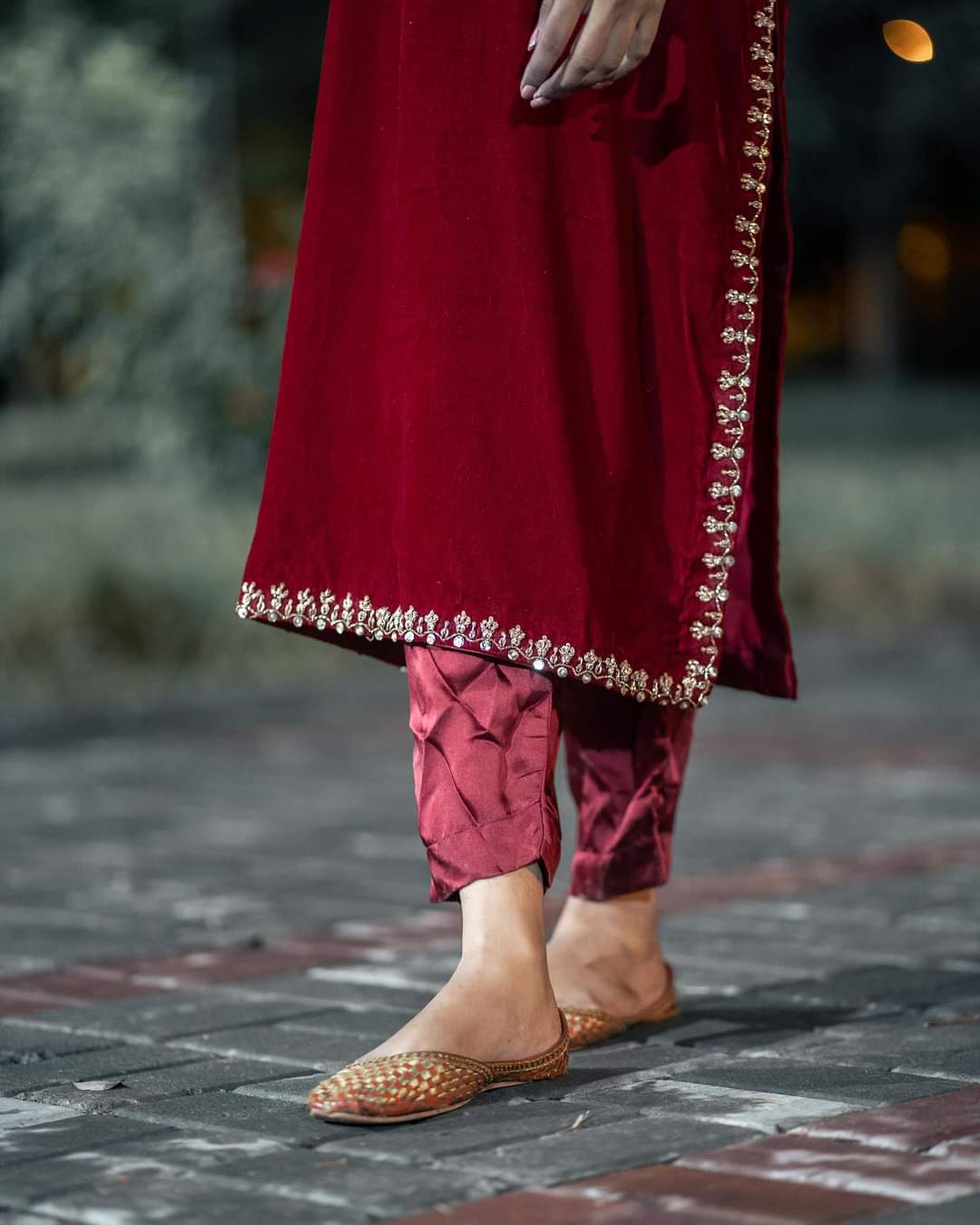 A velvet article embroidered with hand work having dabka, pearls, kinari work.