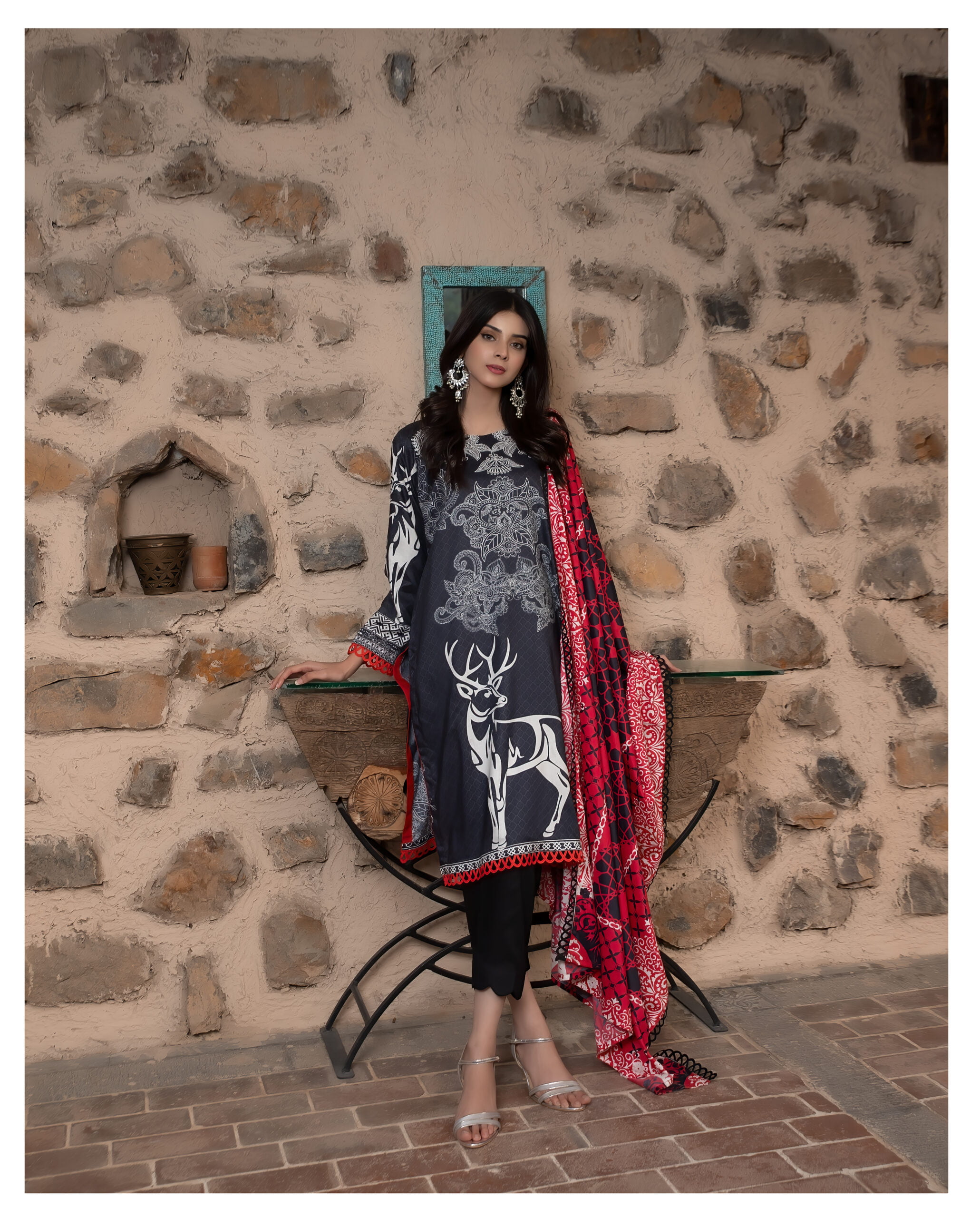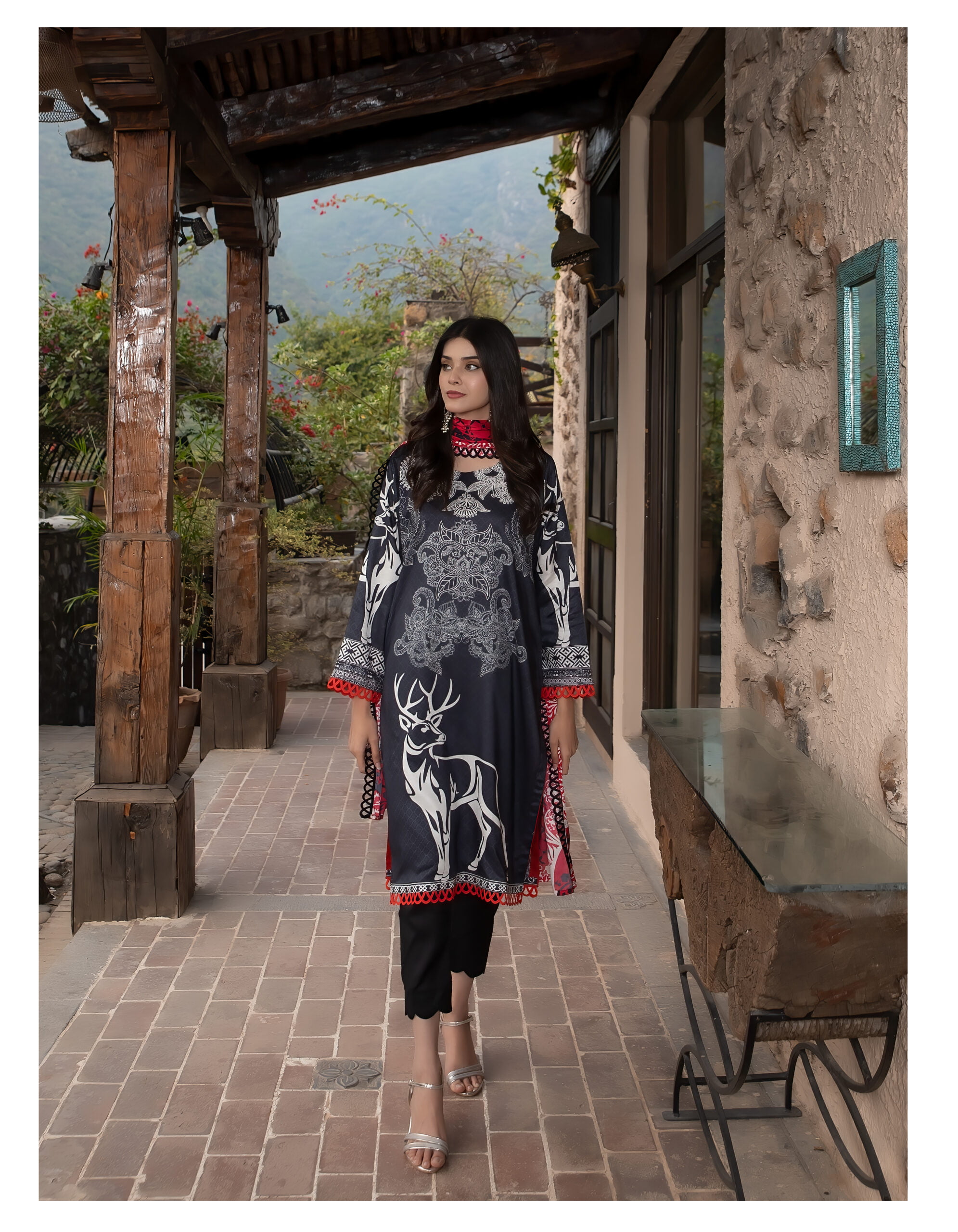 Three-piece. A perfect dress for evening wears, a pure black shirt with red dupatta, having black, white and red prints.